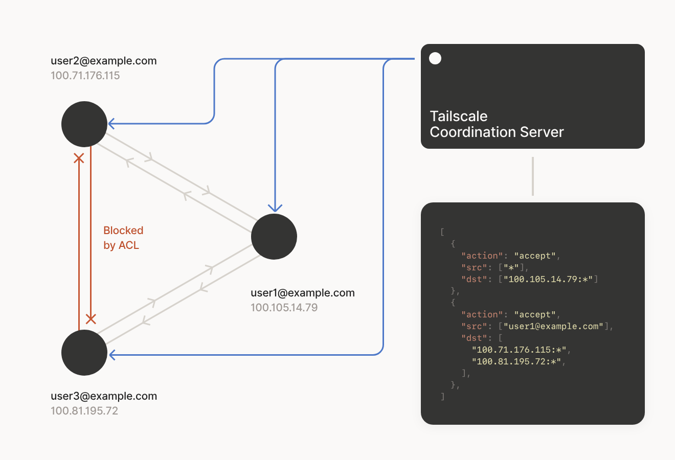 Tailscale 在协调服务器上设置了 ACLS 和 安全策略, 并且自动分发到网络中所有的节点. 在所有的节点上配置同样的防火墙策略